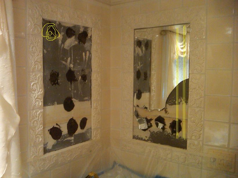 ![]() Removal meant smashing the mirror and cutting away the dura-rock, in doing it we found an exhaust fan vent (left mirror) and water pipes (Right mirror) |