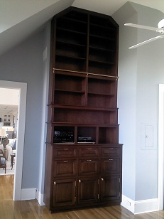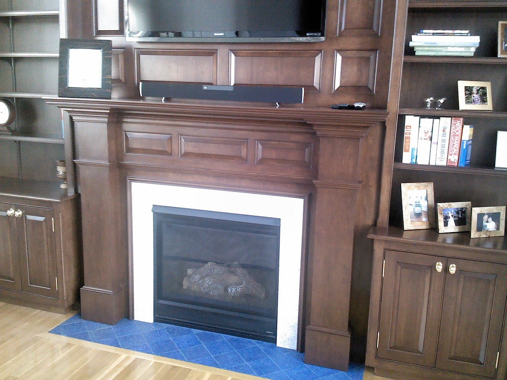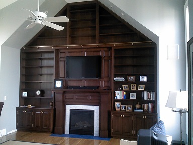A dark stained Library / TV / Fireplace and storage wall.