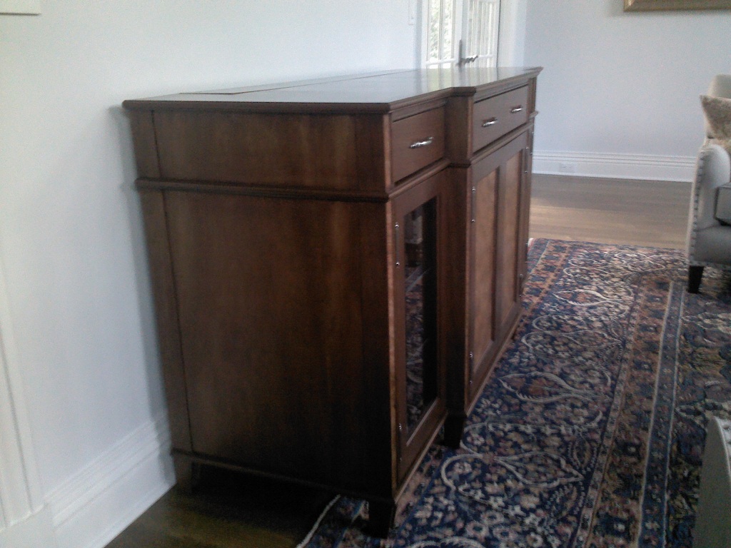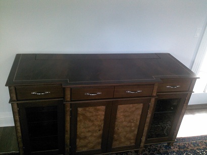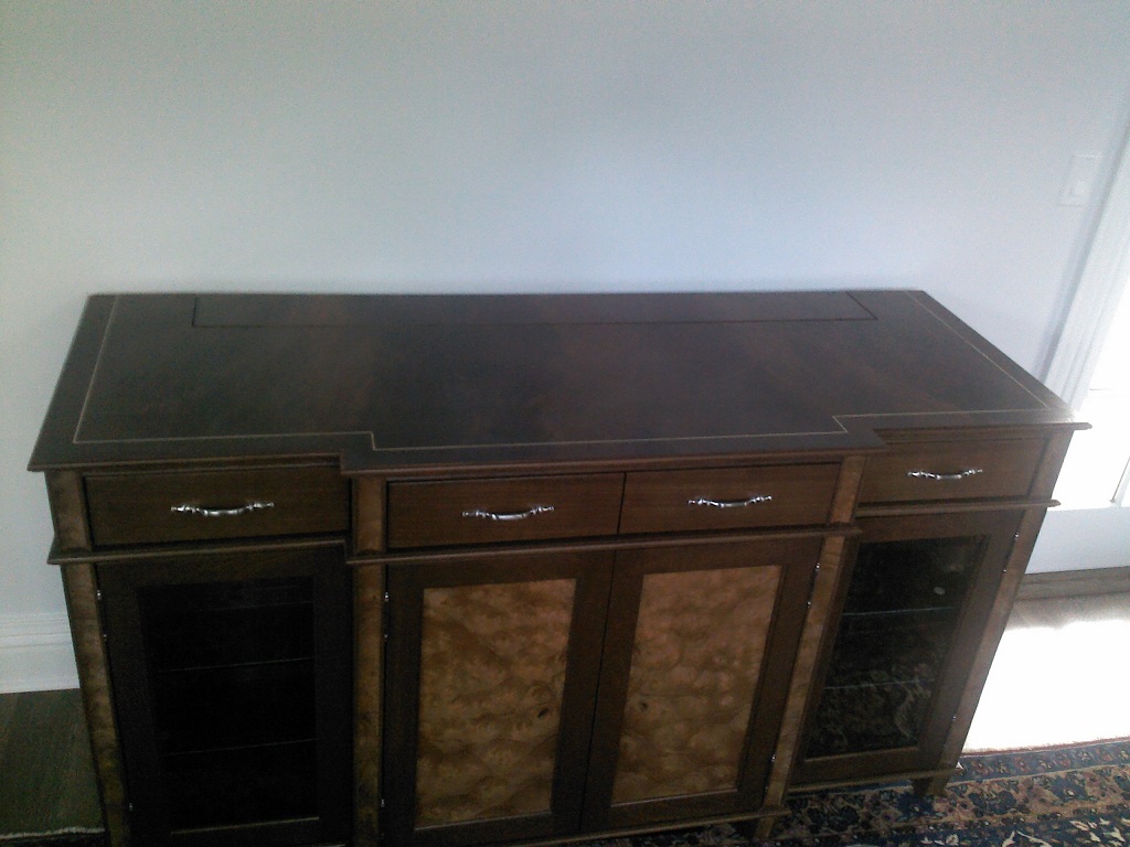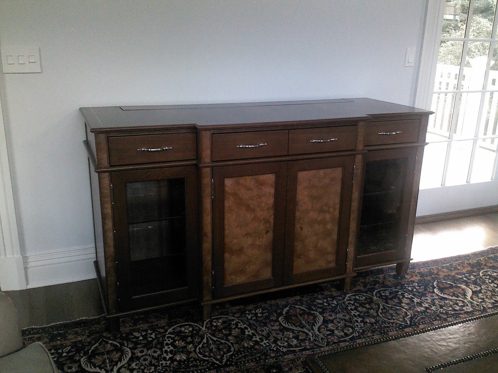 | Mahogany cabinet with Pelin Burl accents and Beveled edged Glass Doors. |