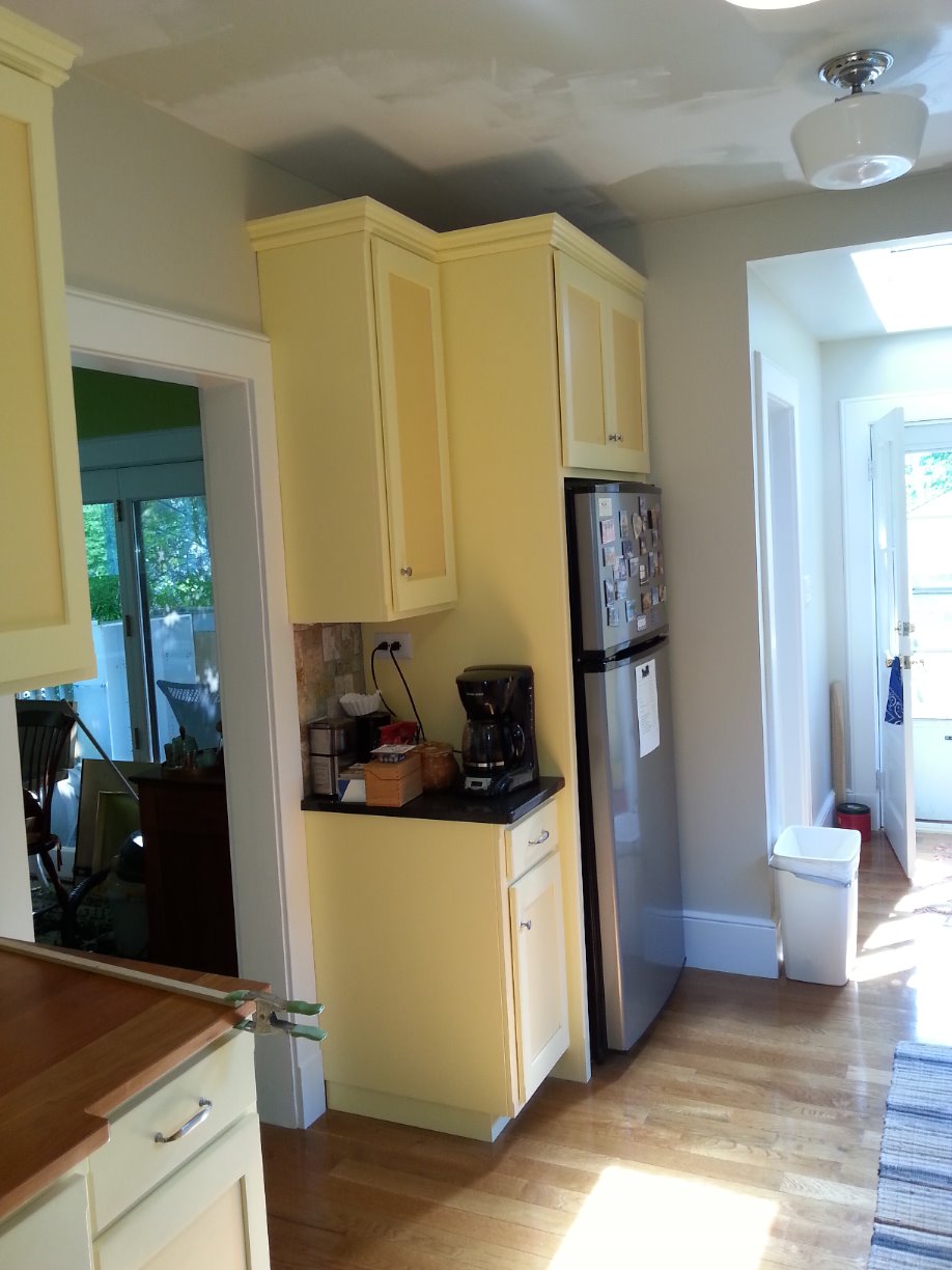 A cherry counter top work station and the refrigrator wall .