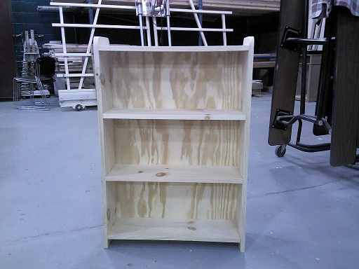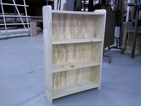 First session student with a pine bookcase with fixed shelves.