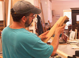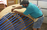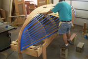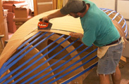 Once the first layer is set the planking is epoxyed to the keel, stem and transom. With that done the master plank are epoxyed in place for the second layer |