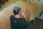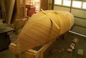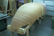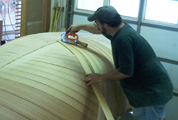 We're using 1/8" cedar veneers. The planking along amidship is 3 1/4". Each plank has to be spiled ( scribe ) into position |